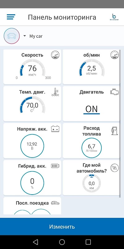 آن لائن موڈ میں کار کے بارے میں ڈیٹا: موجودہ رفتار ، انجن کی رفتار ، بیٹری وولٹیج ، انجن کی حالت / اگنیشن ، ایندھن کی کھپت ، انجن کا درجہ حرارت وغیرہ۔