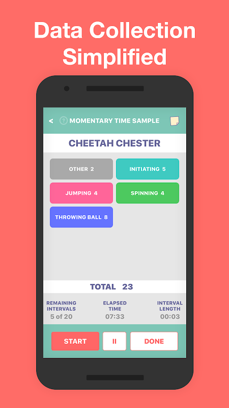 •Results are displayed at the end of the observation session. They can be exported as a table, bar graph, or as a CSV file (e.g. Excel/Numbers) for analysis.