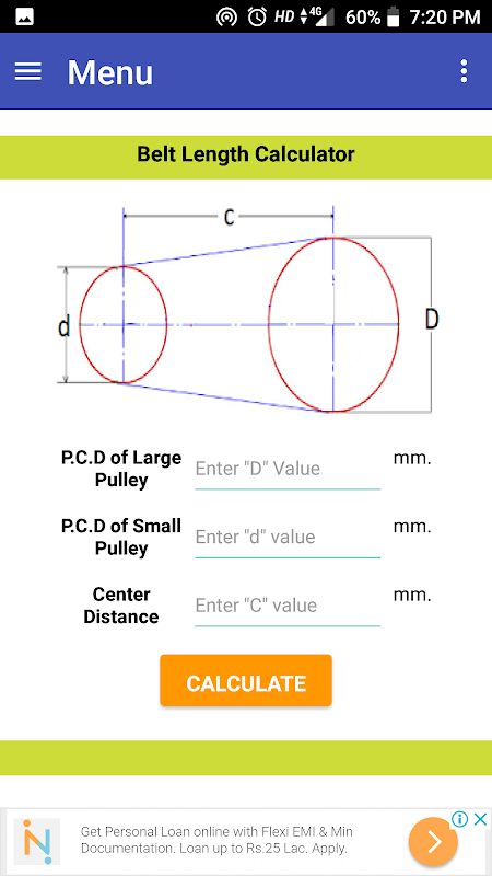 اس ایپ میں بیلٹ کی لمبائی کا حساب لگانے کے لیے درج ذیل آدانوں کی ضرورت ہے۔