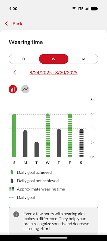 • HearingCoach خصوصیت کے ساتھ اپنی پیشرفت کو ٹریک کریں (Bernafon Encanta اور Alpha XT ماڈلز کے لیے دستیاب)