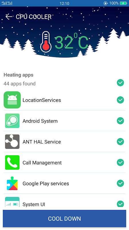 CPU Cooler auto detect overheating apps with a single one-tap Cool Down Button, CPU Cooler will auto find and list overheating apps & processes to select kill to reduce your device temperature.