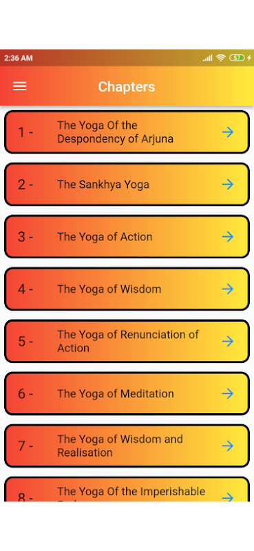 اس حیرت انگیز ایپ کو ایک خوبصورت اور استعمال میں آسان انٹرفیس کے ساتھ استعمال کرنا شروع کریں جس میں بھگوت گیتا کے انگریزی میں مکمل ترجمے ہیں۔ آپ کی تلاش اس ایپ کے ساتھ یہاں ختم ہوتی ہے۔