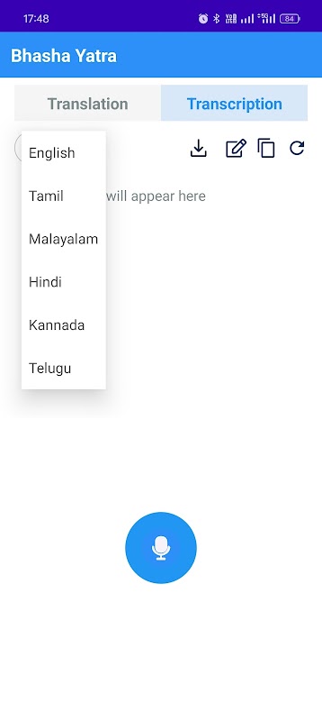 مزید برآں، بھاشا یاترا لائیو ٹرانسکرپشن کی خصوصیات رکھتی ہے، جو آپ کی آواز کو انگریزی، ہندی، تمل، ملیالم، تیلگو اور کنڑ زبانوں میں فوری طور پر متن میں بدل دیتی ہے۔ بعد میں استعمال کے لیے آپ آسانی سے اپنے نقل کردہ متن کو ڈاؤن لوڈ، ترمیم یا کاپی کر سکتے ہیں۔