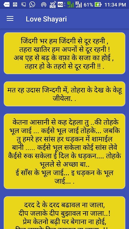 Bihari and Uttar Pradesh's People are alway searching for Bhojpuri video songs, Bhojpuri Shayari and other related with Bhojpuri on Interner using movile or Desktop. In this Application I am going to give you best Bhojpuri Shayari for free.