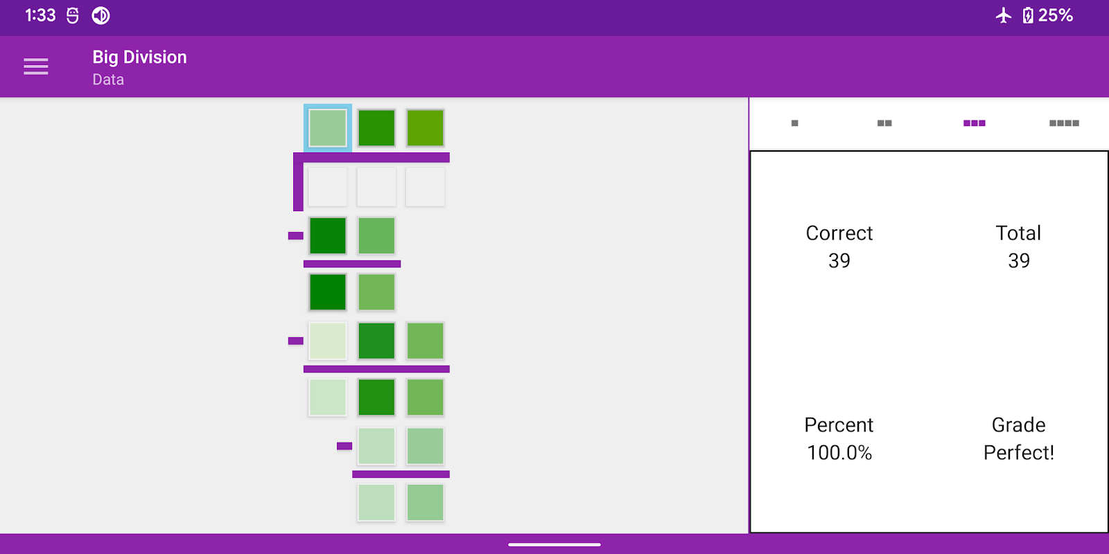 بگ ڈویژن میں مسائل کو 4 سطحوں میں تقسیم کیا گیا ہے، ہر سطح ڈیویڈنڈ کے سائز کی نمائندگی کرتی ہے۔ لیول 1 کے مسائل میں سنگل ہندسوں کے ڈیویڈنڈز ہوتے ہیں، لیول 2 کے مسائل میں 2 ہندسوں کے ڈیویڈنڈ ہوتے ہیں، اور اسی طرح 4 ہندسوں تک کے ڈیویڈنڈز ہوتے ہیں۔ چھوٹے مسائل کو حل کرنے سے بڑے مسائل کھل جاتے ہیں۔
