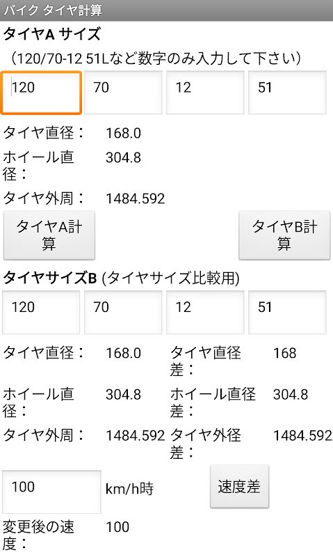スクーターから大型バイクまでタイヤ交換/ホイール交換する際に違うサイズに変更できるか簡単に外周や直径を計算するアプリです。