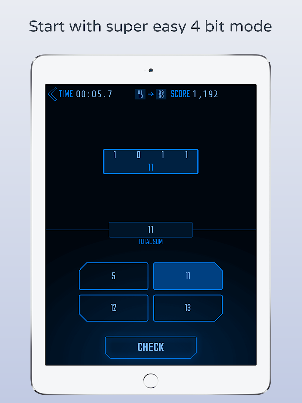 You start in super easy 4-bit binary mode and choose your result from suggestions. Discover new game modes, more numeral systems and advance to larger bit-sizes by mastering each level. We’ve included "Pure" and "Insane" mode where you calculate the exact result, hexadecimal numbers, and numbers with up to 32-bit. The faster you convert the numbers, the higher your score. Are you ready for the Binary Challenge™?