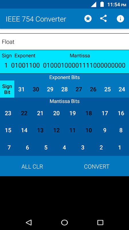 For example if you enter a Float number in the Float box and tap the 'Convert' button the equivalent IEEE 754 Binary and other numbers are shown in the respective boxes instantly.