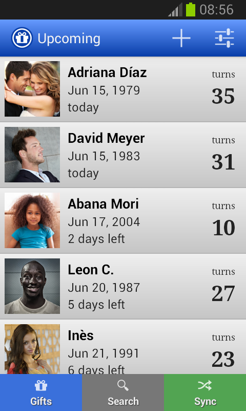 Import all your friends' birthdays from Facebook within seconds. Having all these events in Upcoming puts your reminders on a whole new level of usefulness. So don't forget to synchronize your list with Facebook. This can be done when setting up the app for the first time. And you can also add Facebook at any later point, of course.
