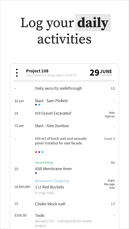 آپ کی ذاتی سرگرمی لاگ • نوکری لاگ • ورک لاگ • زراعت • تعمیرات • انوینٹریز • تعلیم • مینوفیکچرنگ • خدمات • آرٹسٹ • سیلز • خوردہ فروش • تھوک فروش • ڈیزائن • مقامی کاروبار • سہولیات • ٹاسک کنٹرول • ذاتی ڈائری • کمپنیاں