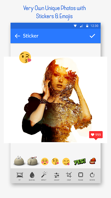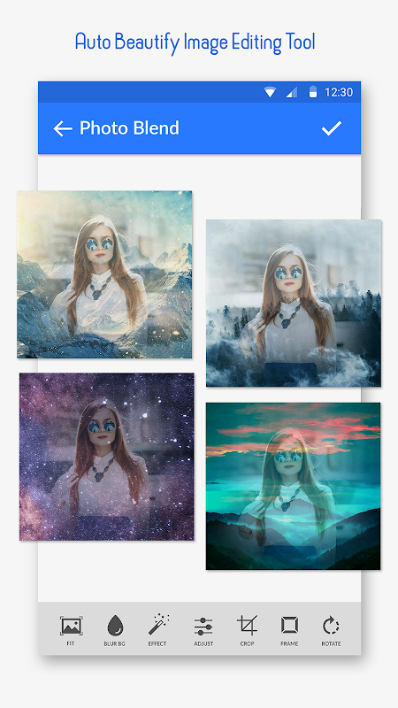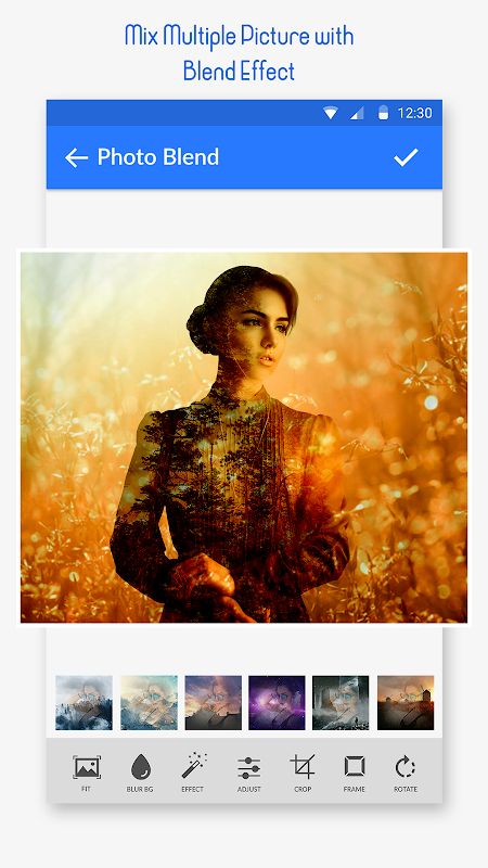 Just load your image from gallery or camera and pick the best available theme, and you are done with awesome photo blender image.