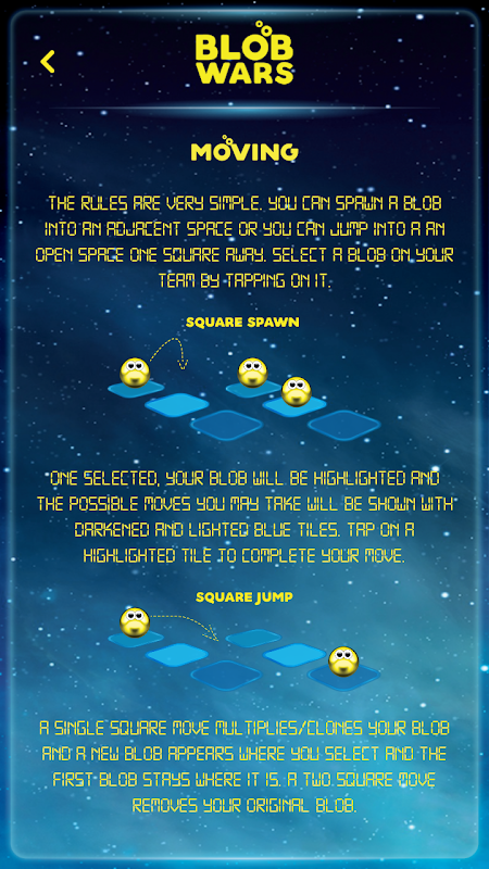 The rules are very simple. You can spawn a blob into an adjacent space or you can jump into a an open space one square away. Select a blob on your team by tapping on it. One selected, your blob will be highlighted and the possible moves you may take will be shown with darkened and lighted blue tiles. Tap on a highlighted tile to complete your move.