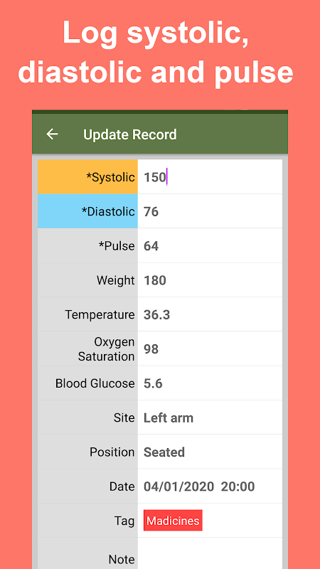 ★ اپنے سسٹولک، ڈائیسٹولک، نبض، گلوکوز، آکسیجن اور وزن کو لاگ ان کریں