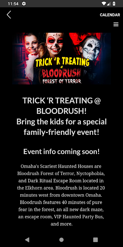 Rated "#1 Haunt In Nebraska" by Cosmopolitan & Ranker, Bloodrush is the LONGEST haunt in the Omaha area! Experience 3 terrifying attractions, bonfires, concessions, an exclusive haunted party bus, & more! Save time, money, and skip the lines by purchasing your tickets through the app! Enable Push Notifications to ensure you get the latest updates, coupons, backstage content, and more!