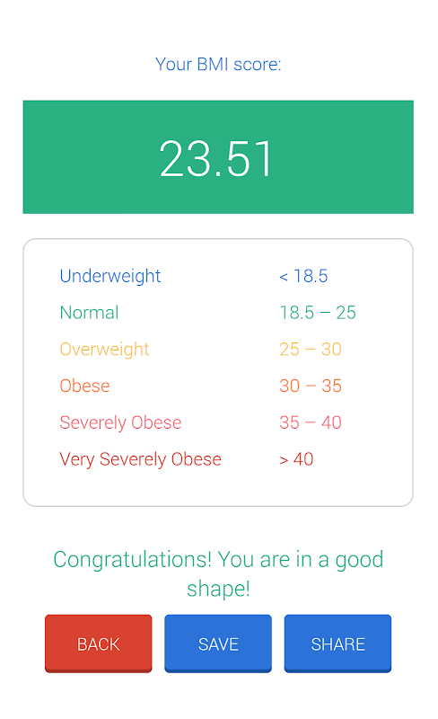BMI کیلکولیٹر آپ کو BMI اسکور اور متعلقہ زمرے یعنی کم وزن ، عمومی ، زیادہ وزن ، موٹاپا ، شدید موٹاپا یا شدید موٹاپا جاننے میں مدد کرتا ہے۔ آپ اپنے BMI اسکور کو بچا سکتے ہیں اور ایپ میں ہی اس سے باخبر رہ سکتے ہیں۔