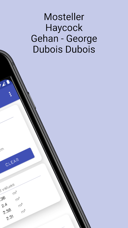 This App only provides the calculation of the four formulas to obtain the value of the BSA body surface. It does not indicate any other data related to medical prescriptions of any kind. For more information on the proper use of the data obtained, consult a specialist.