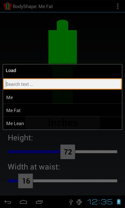 BodyShape shows graphically the body contour shape, given the height and width at waist, and shows instantly by color when the width at waist exceeds the minimum or maximum limits for the given height (too fat or too lean).