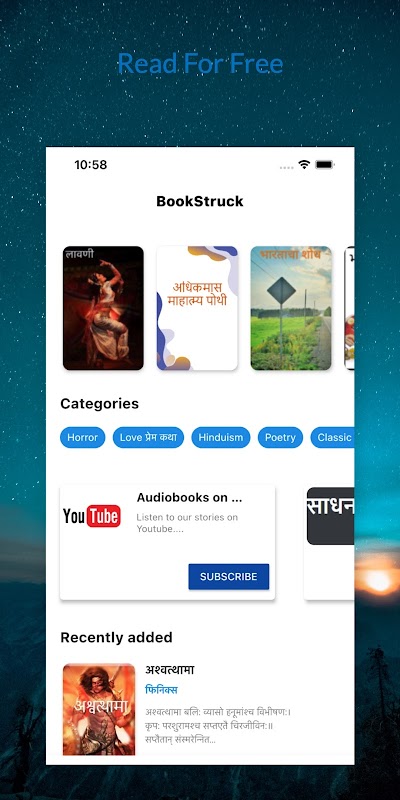 Bookstruck ہندوستانی زبانوں میں کتابیں پڑھنے اور لکھنے کا ایک پلیٹ فارم ہے۔ اس ایپ میں موجود تمام کتابیں مفت ہیں اور آف لائن پڑھنے کے لیے ڈاؤن لوڈ کی جا سکتی ہیں۔ اگر آپ مصنف ہیں تو آپ اپنی کتابیں Bookstruck پر بھی شائع کر سکتے ہیں۔