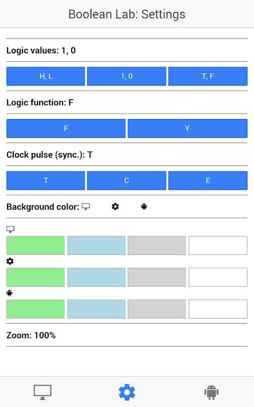 Lze nastavit označení logických hodnot buď ve tvaru 1-0 nebo H-L nebo T-F, označení log. funkcí F nebo Y, označení hodinového signálu T, C nebo E.