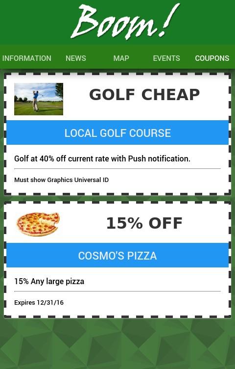 Graphics Universal Incorporated along with Purple Deck Media have developed Boom! The Boom! platform enables local Chambers of Commerce, HOA's, and other local communities to co-brand this mobile app platform at a fraction of the cost of developing their own app. Local communities can now include space on their app as a perk of membership. Significant value will be created for the member businesses and community through the leveraging of the latest in mobile and mobile push technology. Chambers of Commerce and other local communities can share information, drive consumer interest in their local retail centers, post events, etc. Boom!
