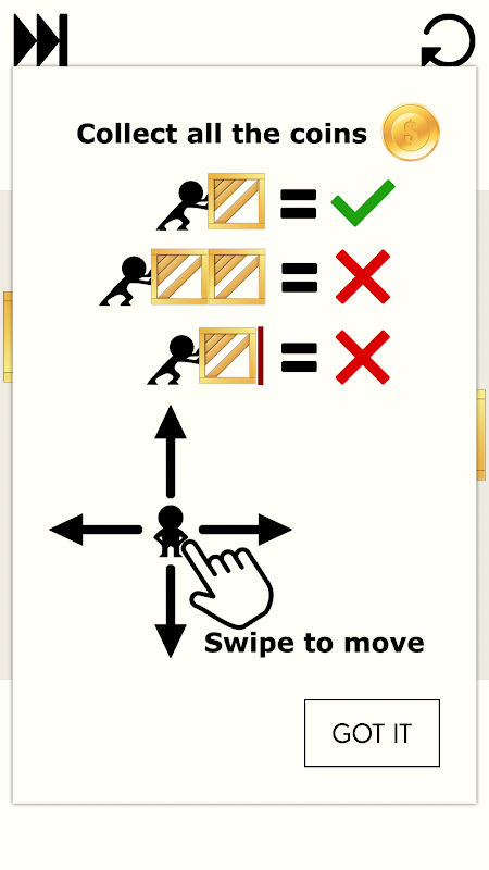 Swipe to move stickman > stickman can push the box > collect all the coins in the maze