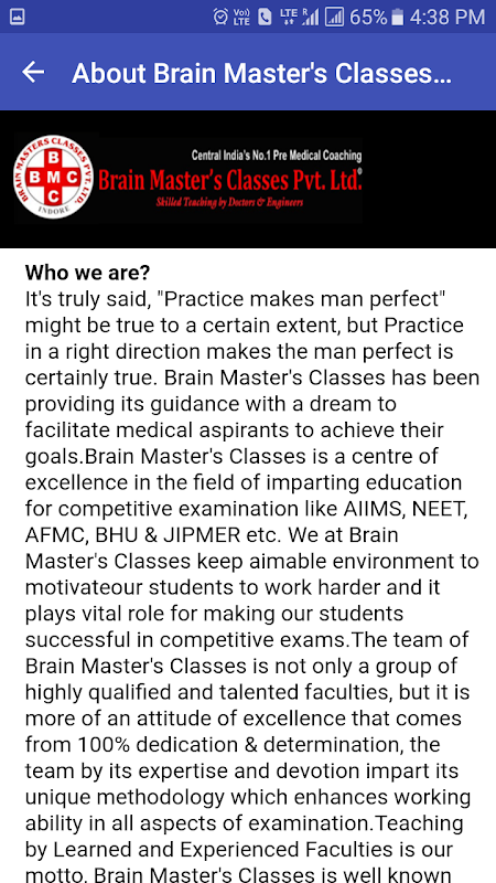 Brain Master's Classes is a centre of excellence in the field of imparting education for competitive examination like AIIMS, NEET, AFMC, BHU & JIPMER etc. We at Brain Master's Classes keep aimable environment to motivate our students to work harder and it plays vital role for making our students successful in competitive exams.
