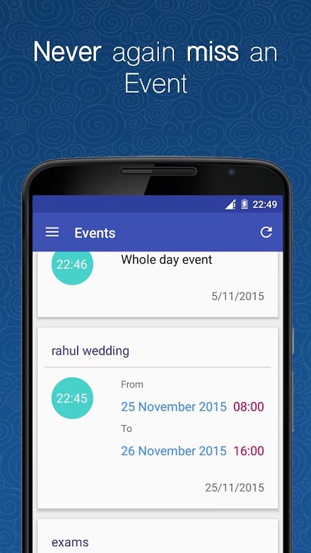 Have an upcoming birthday party, wedding, anniversary celebrations ? Finding it hard to keep track of all upcoming events or prone to forget important dates? Then this feature is the perfect solution for you. Add all your upcoming parties, weddings, anniversaries. You can set reminders for any events of your choice. You can also add alarms prior to events to make sure you do not forget about them.