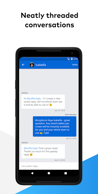 Buffer Reply turns your Twitter, Facebook and Instagram engagement into threaded conversations, all neatly organized into one inbox so you can respond quickly.
