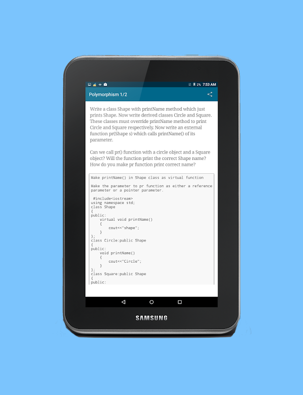 You can read about the concepts of C++, test your knowledge with quiz and read complete programs. Don't worry if you get your answers wrong. The app gives explanations too.