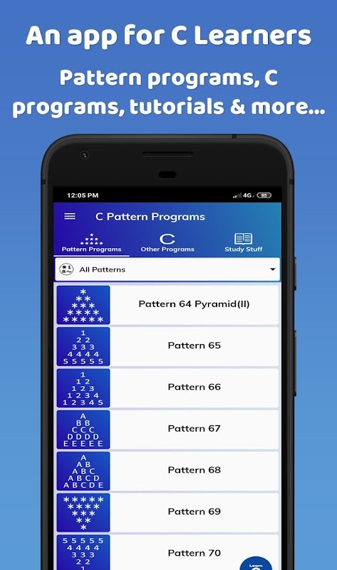 یہ ایپ پیٹرن اور دیگر سی پروگراموں سے بھری ہوئی ہے۔ اس کے علاوہ ، سی پروگرامنگ سے متعلق مطالعہ کی بہت سی چیزیں بھی ہیں۔