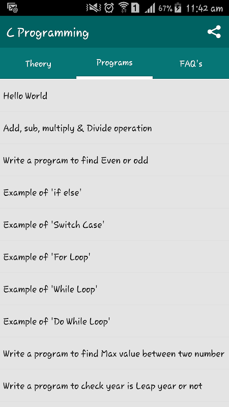 This C Programming app will help you to get in mind basic C programming notes. It is having about 70+ C Programs, and many FAQ's, they chapter description.
