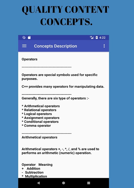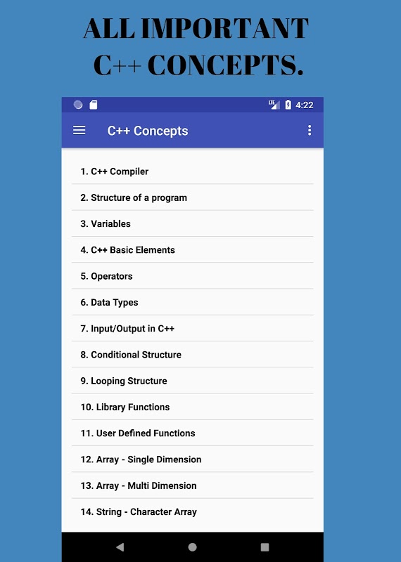 This app helps you refer to a great collection C++ programs and theory on the go and Helps you improve Logical thinking of various problems related to Programming.