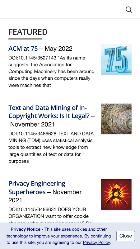 CACM ایپلیکیشن ACM (CACM) میگزین کے ماہانہ کمیونیکیشنز کے موجودہ اور محفوظ شدہ شماروں سے اعلیٰ معیار کا مواد فراہم کرتی ہے۔ یہ ایپلیکیشن آپ کو کسی بھی وقت، کہیں بھی CACM مواد کو پڑھنے، بھیجنے اور محفوظ کرنے کی اجازت دیتی ہے۔