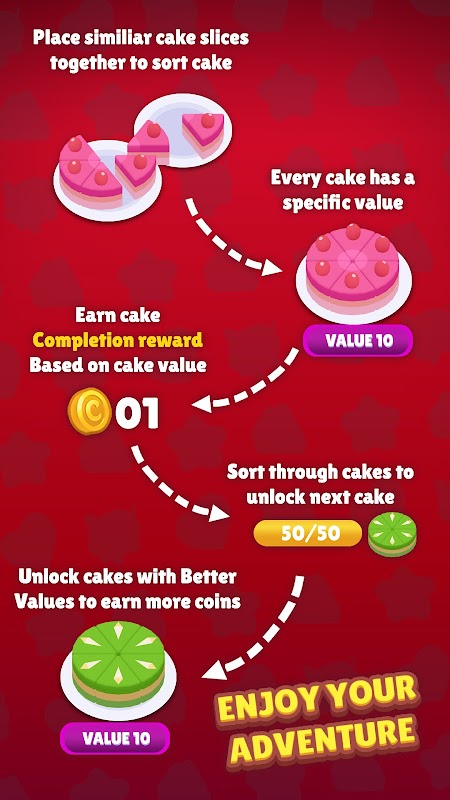 مکمل کیک بنانے کے لیے رنگین کیک کے ٹکڑوں کو ضم کریں، چھانٹنے والے ایڈونچر کو دریافت کریں۔