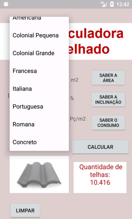 O aplicativo possui um cadastro, com vários tipos de telhas e seus respectivos consumos, por metro quadrado.