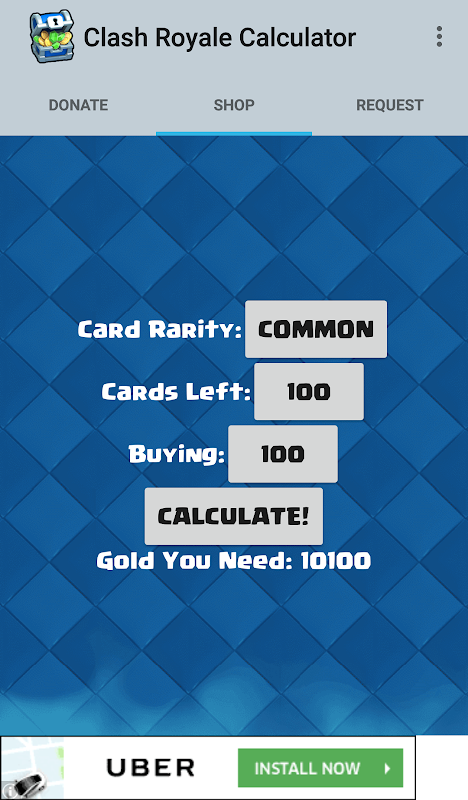 Feature 1: Frequently donates to your clan? Want to see how much you need to donate to earn x amount of gold? We have it made easy for you! Simply enter the gold you need and the application will tell you how much commons you need to donate and also the rares you need to donate.