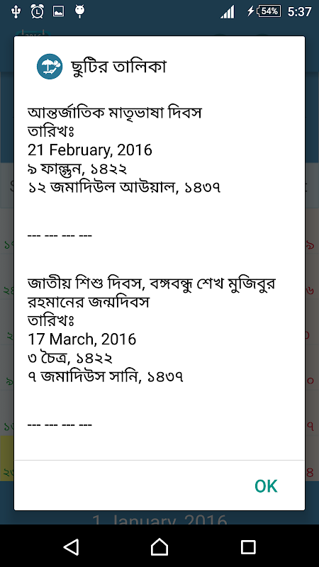 We bring this useful calendar application to celebrate the new year 2016. There are three calendars side by side: the Gregorian Calendar (English), Bengali Calendar and the Hijri (Arabic) Calendar. There are options to select which dates you want to see and in which order you want to see.