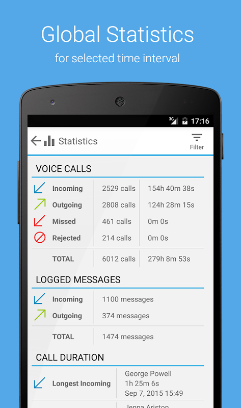 - Apply filters by entry type (voice call / text message), date interval or call direction