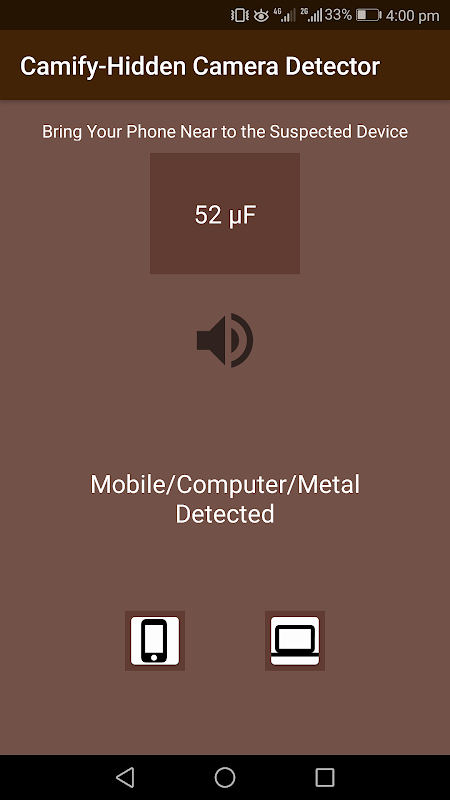 camera detector app protect your privacy from spy hidden camera lenses.Camera Detector app works best detecting all metal cameras up to 15 cm away from your device, and working best detecting ferromagnetic materials, such as detect camera and it can’t detect non-ferromagnetic materials such as aluminum or other material.