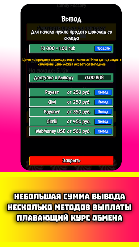 آپ کو منافع کمانے کے لیے زیادہ وقت خرچ کرنے کی ضرورت نہیں ہے۔ "کینڈی فیکٹری" غیر فعال آمدنی کا ایک انوکھا موقع فراہم کرتی ہے - اپنے کاروبار کو ذہن میں رکھیں، اور ایپلی کیشن خود آپ کے لیے پیسے کمانے کا خیال رکھتی ہے!