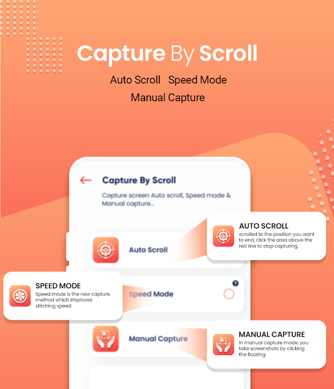 🟠 عمودی طور پر سکرول کرنے اور اسکرین شاٹ لینے کے متعدد موڈز۔