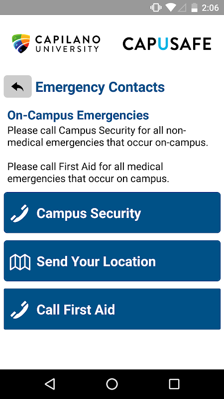 CapUSafe is a mobile safety app for students of Capilano University. The app provides quick access to campus security resources including the campus security emergency contacts, safety resources, emergency prep resources. Also, the app provides tips, information and tools to help students further enhance their security.