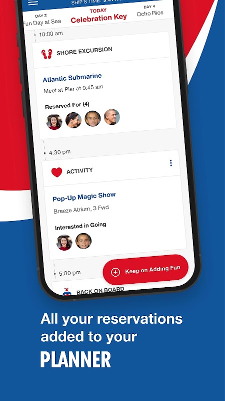 اپنے کروز کاؤنٹ ڈاؤن دوستوں کے ساتھ شیئر کرنے کے لیے Carnival HUB ایپ کا استعمال کریں، پھر ساحل کی سیر، سپا ٹریٹمنٹ، ڈرنک پیکجز اور بہت کچھ دریافت کریں اور بک کریں (بالغوں کے لیے محدود)۔ وقت آنے پر، آپ چیک ان بھی کر سکتے ہیں اور اپنے بورڈنگ دستاویزات حاصل کر سکتے ہیں۔