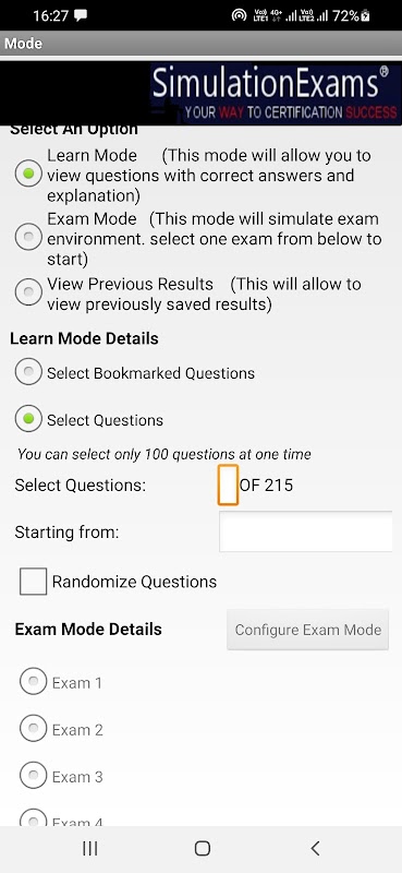 سیکھنے کے موڈ میں ہر سوال کے لیے مکمل وضاحت فراہم کی جاتی ہے، اور امتحان کے موڈ میں اصل امتحان کا ماحول تیار کیا جاتا ہے۔ نتائج کو محفوظ کرنے اور سوالات کا جائزہ لینے کے اختیارات فراہم کیے گئے ہیں۔