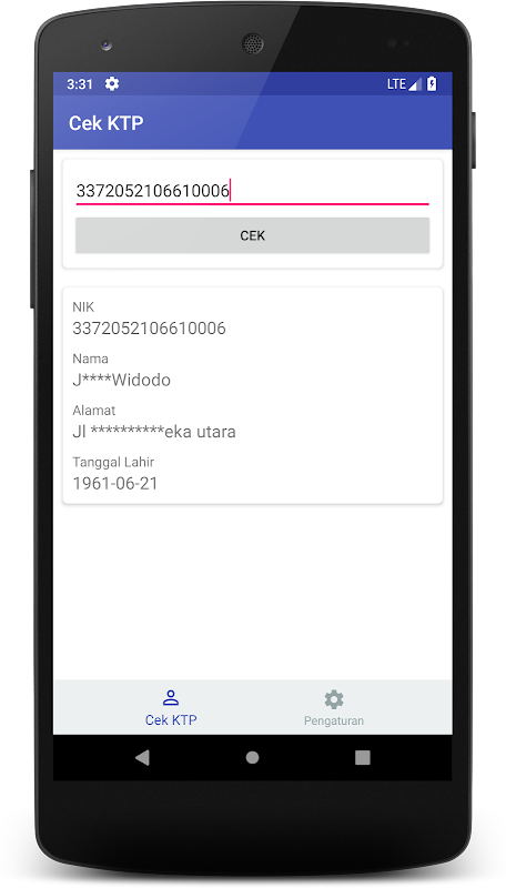 Aplikasi CEK KTP memberikan informasi terkait Kartu Tanda Penduduk (KTP) seperti Nama Lengkap, Alamat dan Tanggal Lahir hanya dengan memasukan Nomor Induk Kependudukan (NIK)