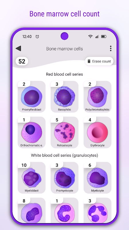 • مختلف گنتی کے طریقے (متفرق ڈبلیو بی سی کاؤنٹ، ریٹیکولوسائٹ کاؤنٹ، بون میرو کاؤنٹ، قابل عمل، نیوباؤر چیمبر، آر بی سی اسامانیتا، پلیٹلیٹ کا شمار، اور مزید)۔