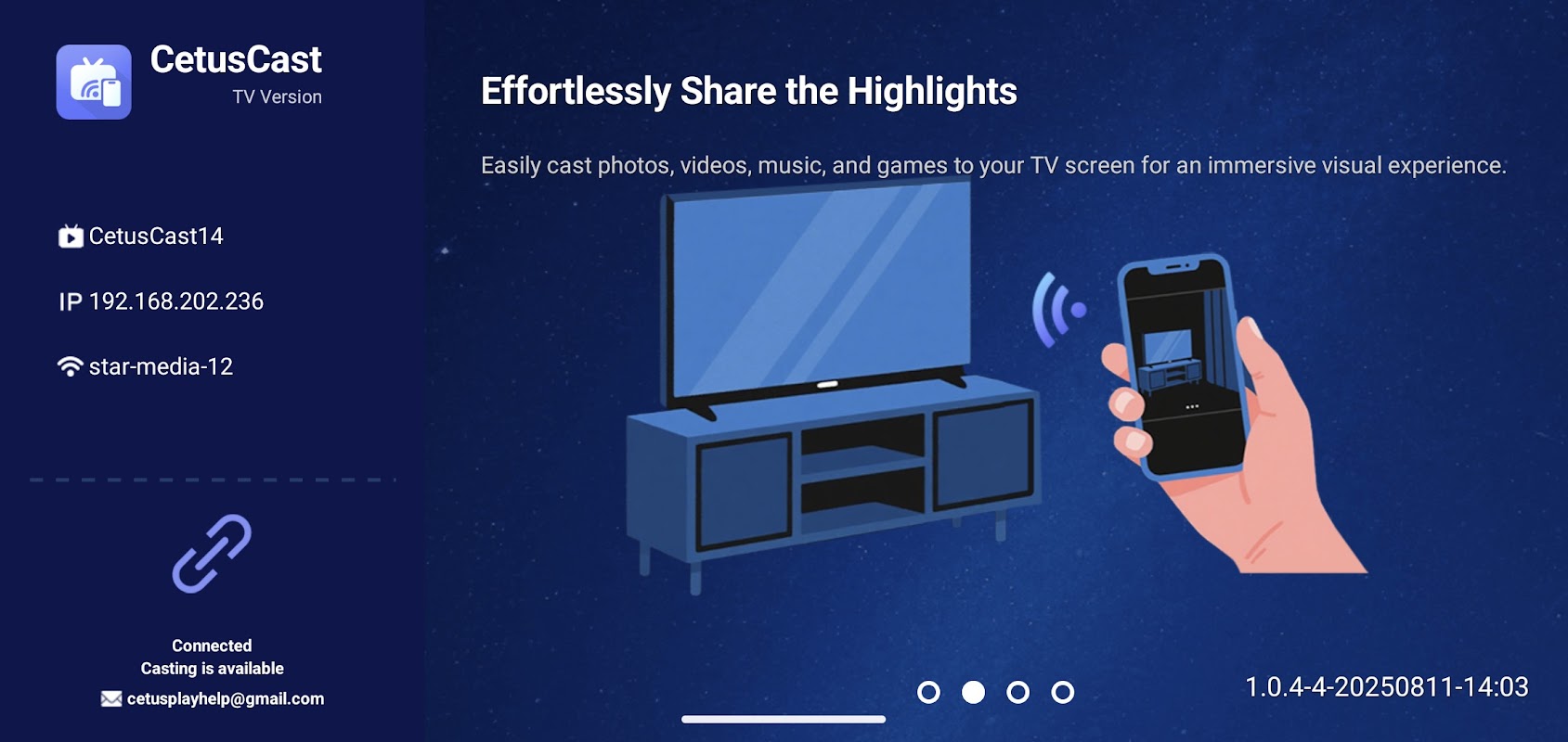 CetusCast TV ایک طاقتور اور استعمال میں آسان کاسٹنگ ایپ ہے جسے Android TV اور سیٹ ٹاپ باکسز کے لیے ڈیزائن کیا گیا ہے۔ چاہے گھریلو تفریح، کاروباری میٹنگز، یا کلاس روم میں تدریس کے لیے، CetusCast آپ کو بڑی اسکرین پر بغیر کسی رکاوٹ کے اپنے پسندیدہ مواد کا اشتراک کرنے دیتا ہے۔