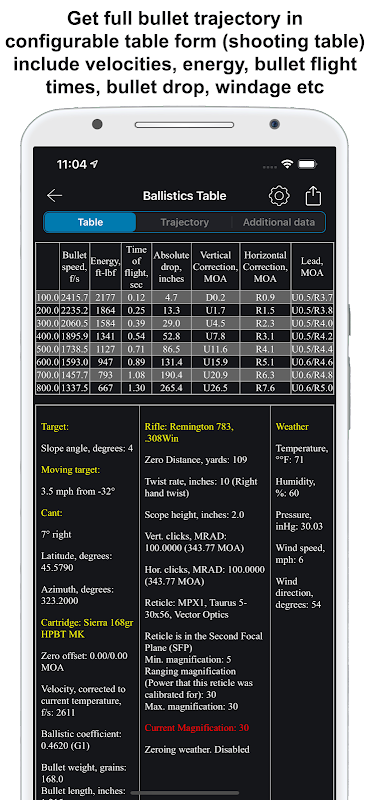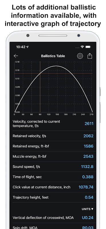 یہ ایپ درجہ حرارت، اونچائی، نمی، ماحول کا دباؤ، ہدف کا فاصلہ، ہدف کی رفتار اور سمت، کوریولیس اثر، ڈھلوان کا زاویہ، کینٹ اور آپ کی رائفل کی ترتیب کو زیادہ سے زیادہ عمودی، افقی اور لیڈ درست کرنے کے لیے استعمال کر رہی ہے۔