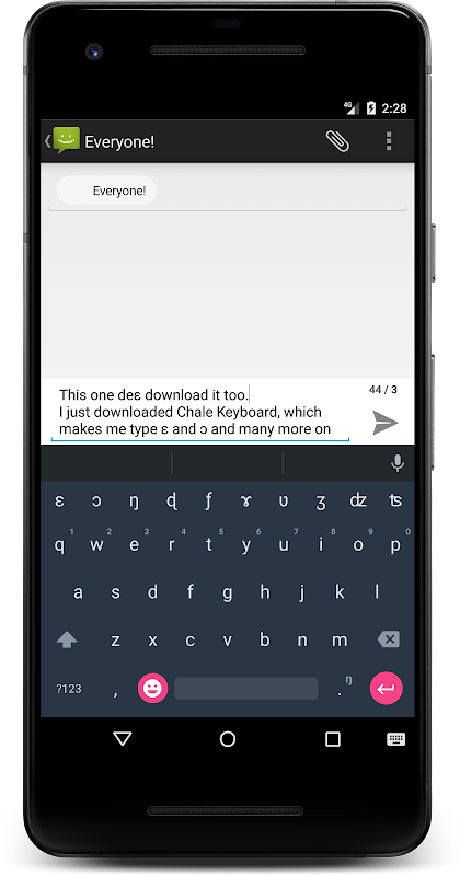 Chale Keyboard is an Android keyboard designed to enable the use of special Ghanaian language characters in texting. You can now use your favourite characters such as 'Ɛ' and 'Ɔ' when texting on WhatsApp, Tweeting or posting on Facebook and many more. It works for all applications and for all social media.