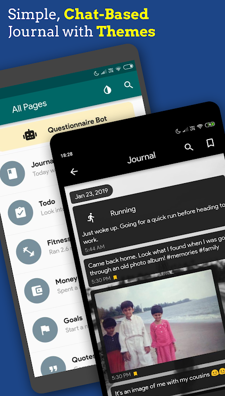 خود کی بہتری کی طرف اپنے سفر میں چیٹ جرنل کو اپنا ذاتی ساتھی بنائیں۔ یہ ایک سادہ ، ایک قسم کی ، چیٹ پر مبنی جریدے کی ایپلی کیشن ہے جو اس کی اصل میں سادگی کے ساتھ تیار کیا گیا ہے۔ ایک بہترین جرنل ہونے کے علاوہ ، یہ آپ کو فوری نوٹ لینے میں اور یک طرفہ گفتگو کے طور پر اپنے خیالات کے سلسلوں کو دیکھنے میں بھی مدد کرتا ہے۔